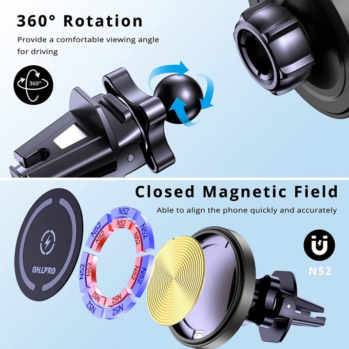 - 【Stronger Magnetic】The Magsafe case has a built-in N52 magnetic coil that automatically aligns with the MagSafe car charger. 360° rotating magnetic makes wireless charging faster and easier. It supports various magnetic accessories like power bank, magsafe wallet and magnetic car mount. The vent clip can be installed in the air vent of the car, and the 3m adhesive base is pasted to the dashboard without blocking the air.