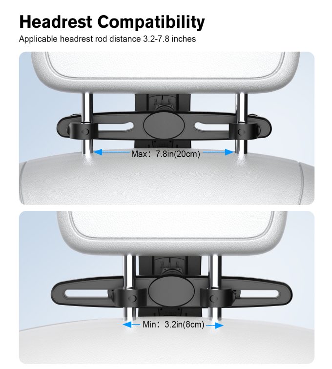 - OHLPRO tablet holder for car back seat fits 3.3 -7.8 inch ( (8.5-20 cm) car headrest bars. It is so stable after installation that it will not move even if your child touches it.